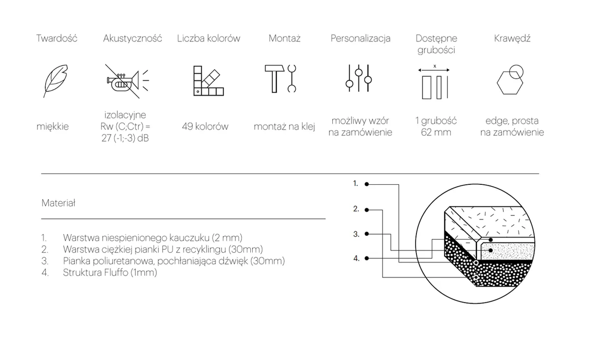 Panele z kolekcji Fluffo IZO, nie tylko pięknie ozdobią wnętrze, ale także pomogą odizolować je od zewnętrznych źródeł dźwięku. Dzięki zastosowaniu warstw odpowiednich materiałów, panele jednocześnie absorbują dźwięk i stanowią dla niego zaporę, działając w dwie strony: nie przepuszczają dźwięku z zewnątrz i nie wypuszczają go z pomieszczenia. Są idealnym rozwiązaniem wszędzie tam, gdzie za cienką, działową ścianą słyszymy sąsiada, gdzie ściana w biurze przenosi dźwięk między pomieszczeniami, gdy chcemy swobodnie rozmawiać w sali konferencyjnej.